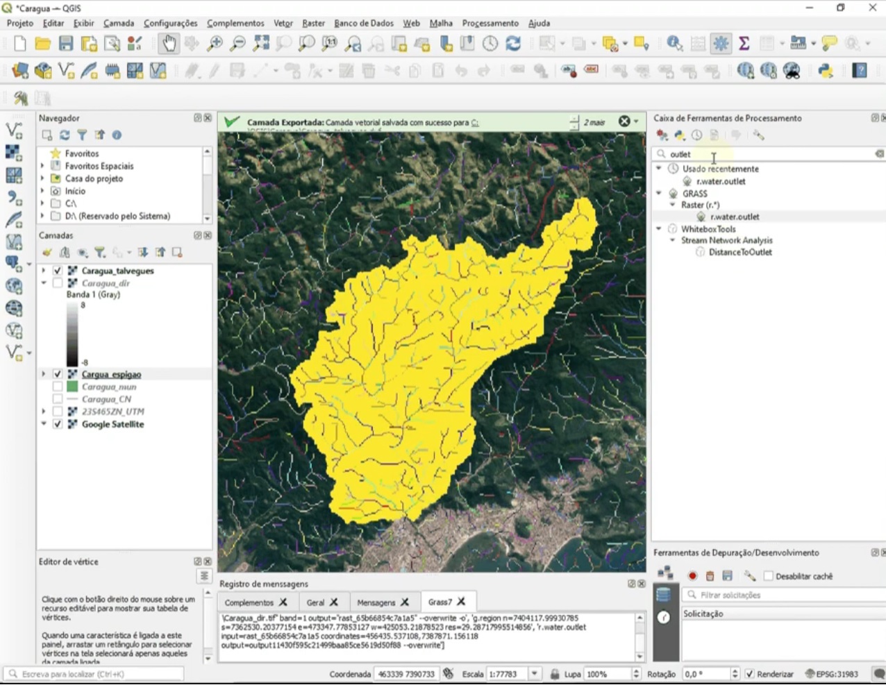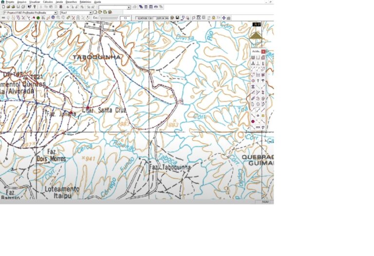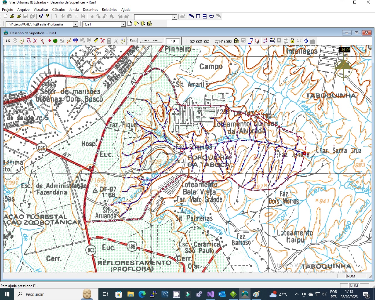 Se você preferir trabalhar com métodos mais tradicionais você pode importar mapas do IBGE, em qualquer escala, e com facilidade os talvegues e o espigão da bacia serão definidos. Após essa definição o Vias Urbanas & Estradas executará todos os cálculos geométricos e hidrológicos da bacia.